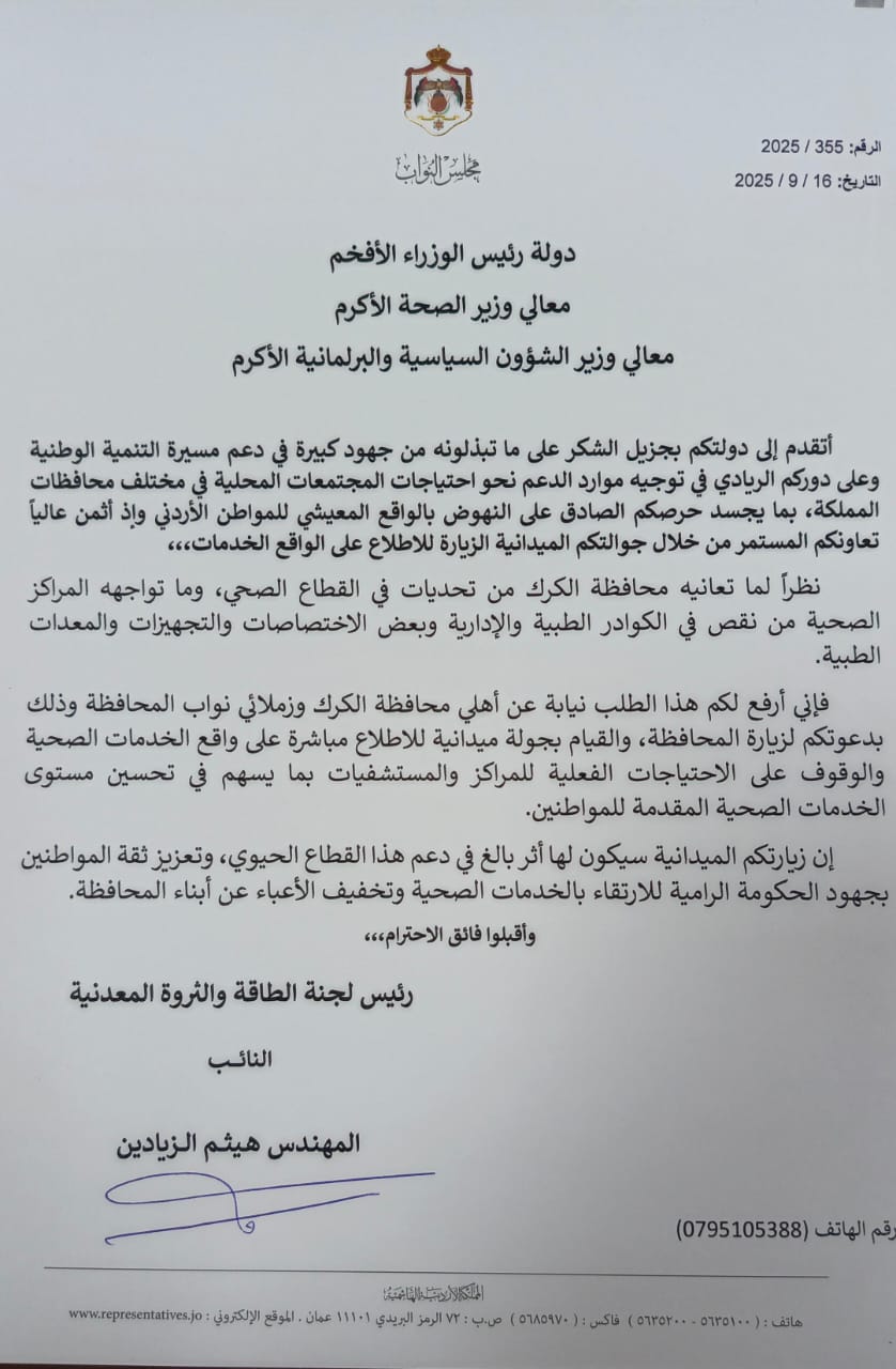 وجه النائب هيثم زيادين، اليوم الأربعاء، دعوة إلى رئيس الوزراء لزيارة محافظة الكرك؛ للاطلاع على واقع القطاع الصحي في المحافظة، والتحديات التي تواجهه من نقص في الكوادر الطبية والإدارية ، وبعض الاختصاصات والتجهيزات، والمعدات لتقديم الخدمة الطبية لكل سكان المحافظة.