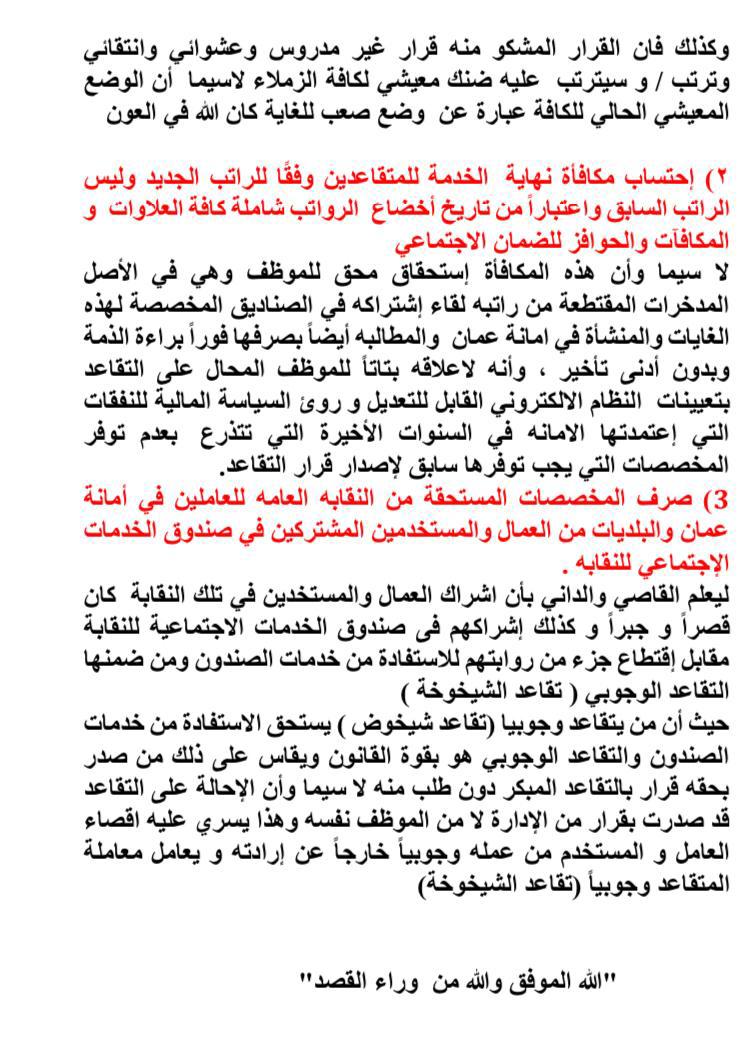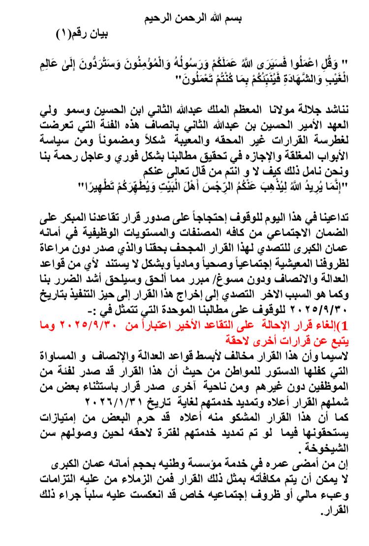 أصدر عدد من موظفي أمانة عمّان الذين أُحيلوا على التقاعد المبكر بيانًا احتجاجيًا، عبّروا فيه عن رفضهم للإجراءات الأخيرة التي قالوا إنها تسببت بانخفاض رواتبهم وفقدانهم بعض الامتيازات الوظيفية.
