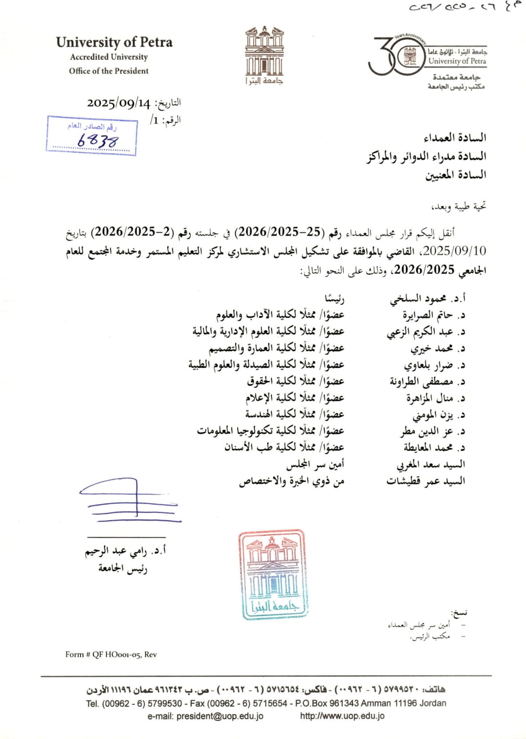 صدور قرار مجلس العمداء في جامعة بترا ، بتعيين الإستشاري جراحة الفم والوجه والفكين الأستاذ الدكتور المعايطة نائبا لعميد كلية طب الأسنان في جامعة بترا لشؤون الأكاديمية والإدارية