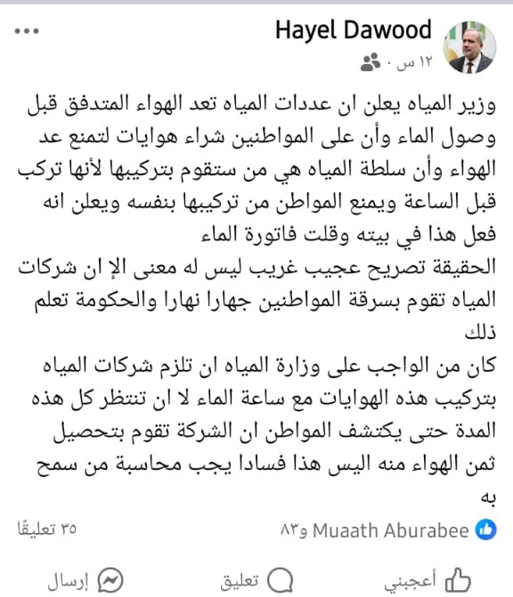 وزير المياه يعلن ان عدادات المياه تعد الهواء المتدفق قبل وصول الماء وأن على المواطنين شراء هوايات لتمنع عد الهواء وأن سلطة المياه هي من ستقوم بتركيبها لأنها تركب قبل الساعة ويمنع المواطن من تركيبها بنفسه ويعلن انه فعل هذا في بيته وقلت فاتورة الماء ، الحقيقة تصريح عجيب غريب ليس له معنى الإ ان شركات المياه تقوم بسرقة المواطنين جهارا نهارا والحكومة تعلم ذلك.