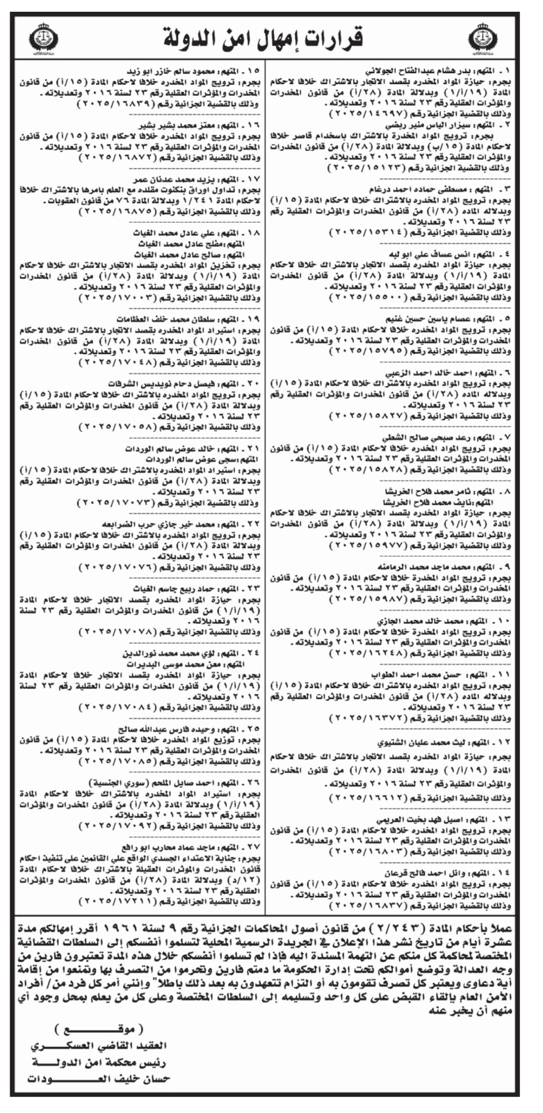 وأكد رئيس محكمة أمن الدولة، العقيد القاضي العسكري حسان خليف العودات، أنه في حال لم يسلم المتهمون أنفسهم خلال المهلة المحددة، فسيتم اعتبارهم فارين من وجه العدالة، وتوضع أموالهم تحت إدارة الحكومة ما داموا فارين، ويحرمون من حق التصرف بها أو إقامة أي دعاوى قانونية.