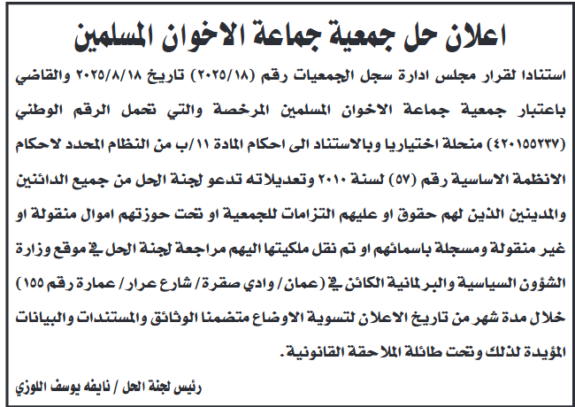استنادا لقرار مجلس إدارة سجل الجمعيات رقم (۲۰۲۵/۱۸) تاريخ ٢٠٢٥/٨/١٨ والقاضي باعتبار جمعية جماعة الإخوان المسلمين المرخصة والتي تحمل الرقم الوطني (٤۲۰۱۵۵۲۳۷) منحلة اختياريا وبالاستناد الى احكام المادة ١١ / ب من النظام المحدد لأحكام الأنظمة الاساسية رقم (٥٧) لسنة ۲۰۱۰ وتعديلاته، تدعو لجنة الحل من جميع الدائنين والمدينين الذين لهم حقوق او عليهم التزامات للجمعية او تحت حوزتهم اموال منقولة او غير منقولة ومسجلة باسمائهم او تم نقل ملكيتها اليهم مراجعة لجنة الحل في موقع وزارة الشؤون السياسية والبرلمانية الكائن في ( عمان / وادي صقرة / شارع عرار / عمارة رقم (١٥٥ ) خلال مدة شهر من تاريخ الإعلان لتسوية الأوضاع متضمنا الوثائق والمستندات والبيانات المؤيدة لذلك وتحت طائلة الملاحقة القانونية.