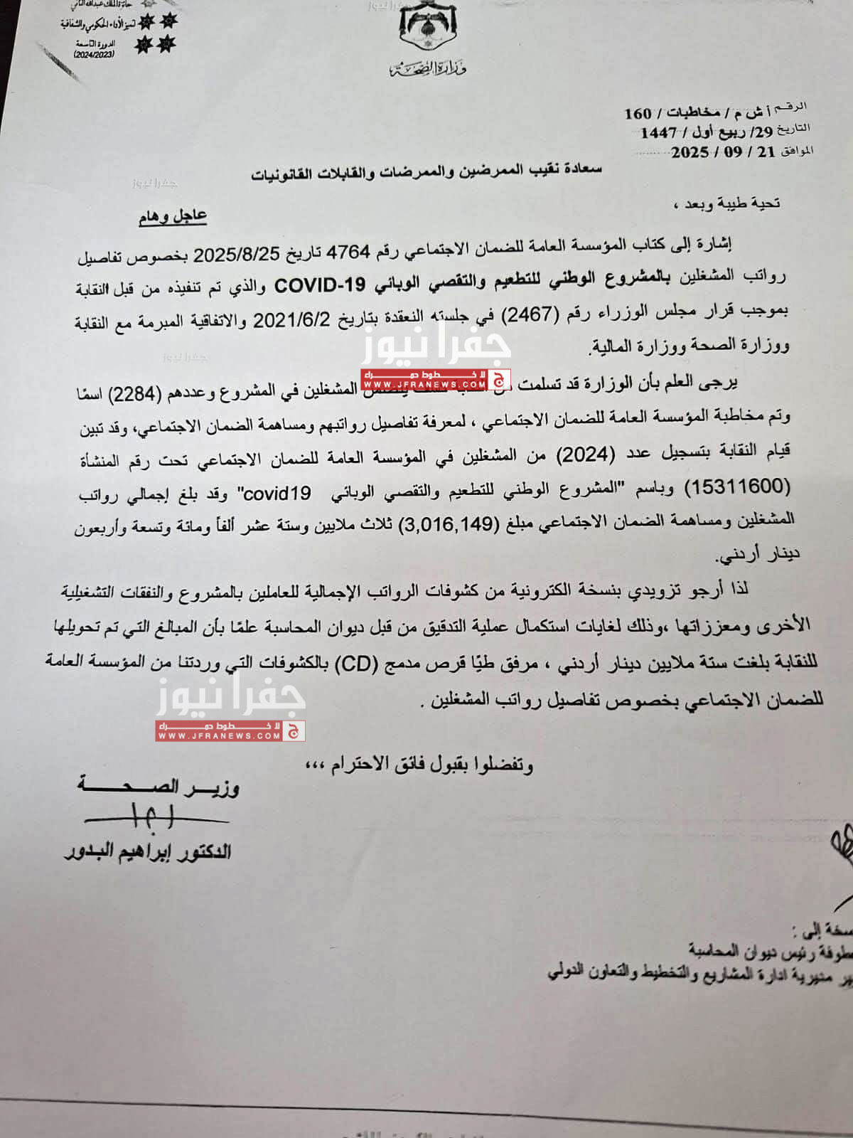 وبحسب الكتاب، تسلمت الوزارة من النقابة كشف يتضمن المشغلين في المشروع وعددهم (2284) اسما وتم مخاطبة المؤسسة العامة للضمان الاجتماعي ، المعرفة تفاصيل رواتبهم ومساهمة الضمان الاجتماعي، وقد تبين قيام النقابة بتسجيل عدد (2024) من المشغلين في المؤسسة العامة للضمان الاجتماعي تحت رقم المنشأة (15311600) وباسم المشروع الوطني للتطعيم والتقصي الوبائي covid19" وقد بلغ إجمالي رواتب المشغلين ومساهمة الضمان الاجتماعي مبلغ (3,016,149) ثلاث ملايين وستة عشر ألفاً ومائة وتسعة وأربعون دينار أردني.