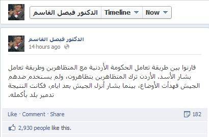 وكتب القاسم في صفحتيه على فيس بوك وتويتر مساء الخميس : قارنوا بين طريقة تعامل الحكومة الأردنية مع المتظاهرين وطريقة تعامل بشار الأسد. الأردن ترك المتظاهرين يتظاهرون ، ولم يستخدم ضدهم الجيش فهدأت الأوضاع، بينما بشار أنزل الجيش بعد ايام، فكانت النتيجة تدمير بلد بأكمله.