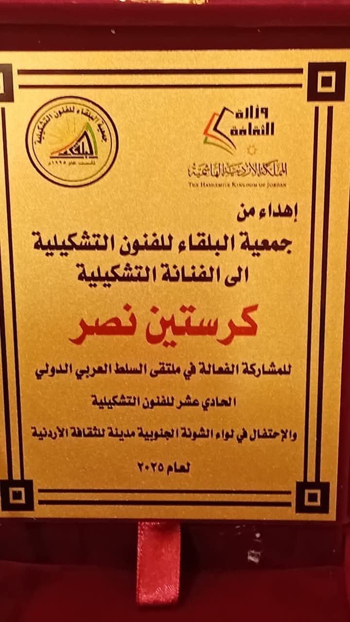 شاركت الكاتبة والفنانة التشكيلية والمهندسة المعمارية كريستين حنا نصر في معرض دولي للفن التشكيلي في الاردن ، حيث جرى تحت رعاية محافظ البلقاء الاستاذ المساعيد اقامة معرض ملتقى السلط العربي و الدولي للفنون التشكيلية يوم السبت بتاريخ 27 ايلول 2025م ، وقد شاركت فيه المهندسة المعمارية و الكاتبة كريستين نصر كفنانة تشكيلية تحمل موهبتها معها في هذا المجال برفقة مجموعة مميزة من فنانين الاردن وعدد من دول الوطن العربي بهدف زيادة اواصر التشارك العربي وتفعيل الحضور الجماعي اضافة الى حمل رسالة هذا الفن الانساني المعبر عن قيم الانسانية وتطلعاتها نحو الجمال والسلام والمحبة في هذا الوقت العصيب الذي يشهد صراعات وازمات يجب على الفنان التفاعل معها معبرا عن هموم وتطلعات الناس ، وجاءت المشاركة ضمن فعاليات تدعم الوطن وتنشط السياحة وتدعم المجتمع المحلي فكانت رمزية مشاركتها رسالة حب للفن والوطن .