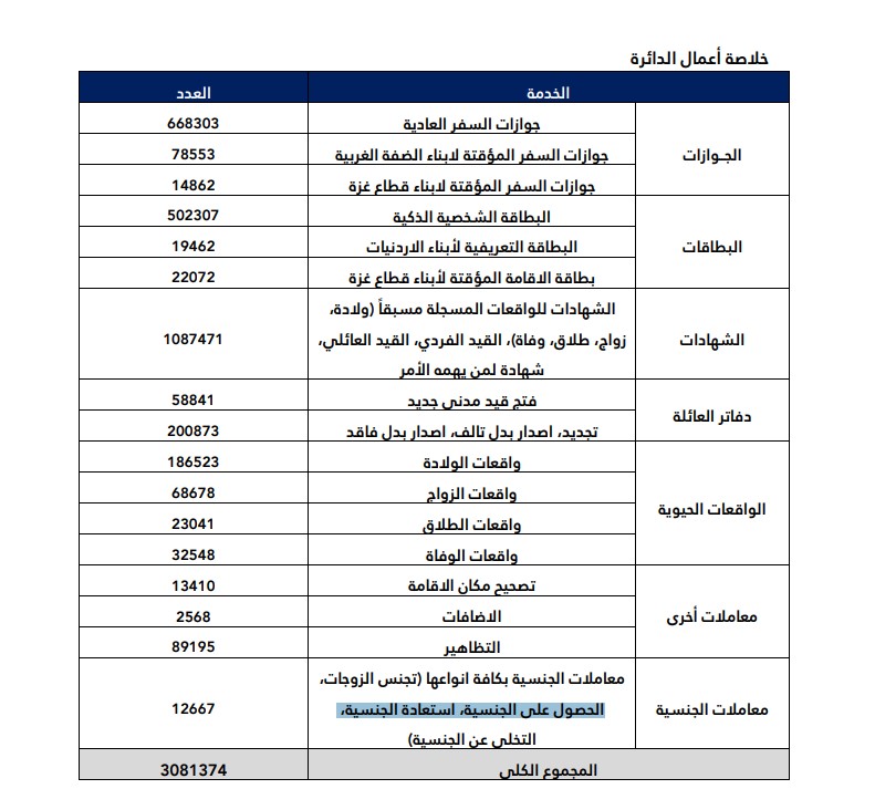 بلغ عدد معاملات الجنسية بكافة أنواعها (تجنس الزوجات، والحصول على الجنسية، واستعادة الجنسية، والتخلي عن الجنسية)، التي أنجزتها دائرة الأحوال المدنية والجوازات في العام 2024، 12667 معاملة.