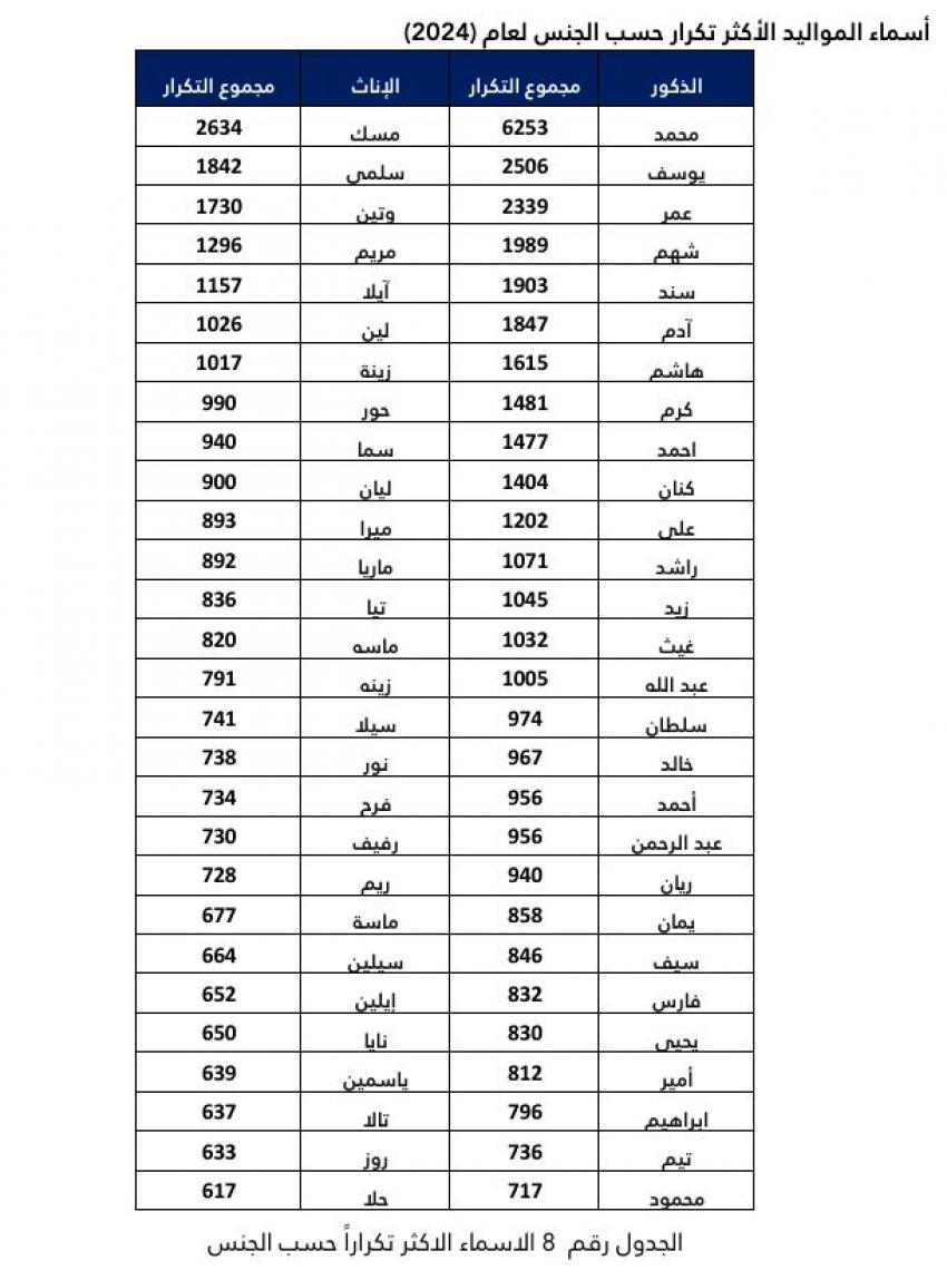 وتاليا أسماء المواليد الأكثر تكرارا للعام 2024: