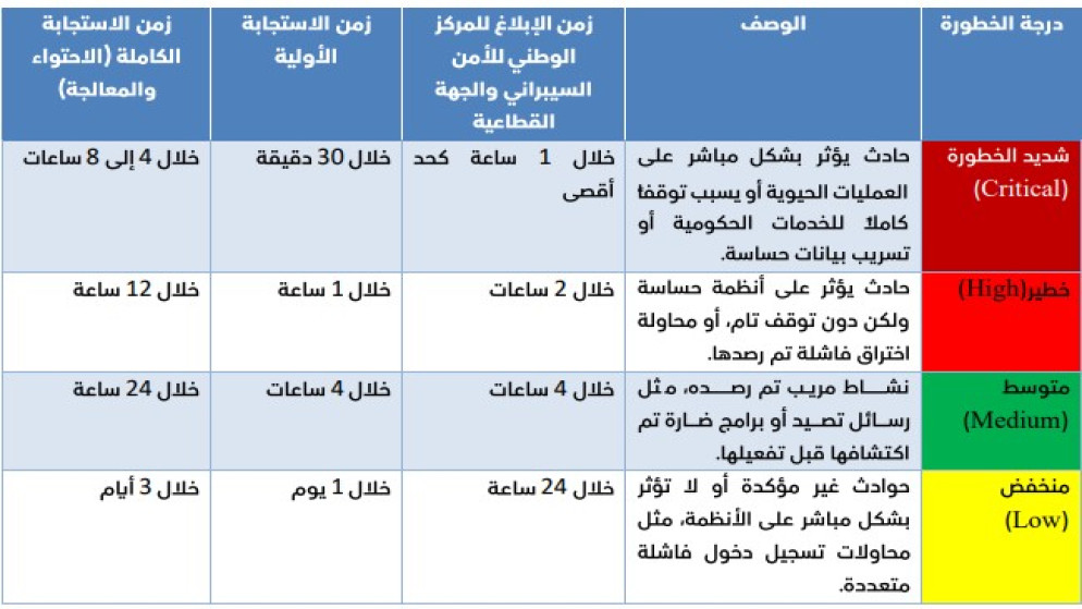 - حادث شديد الخطورة: يؤثر بشكل مباشر على العمليات الحيوية أو يؤدي إلى توقف كامل للخدمات الحكومية، أو يتضمن تسريب بيانات حساسة.