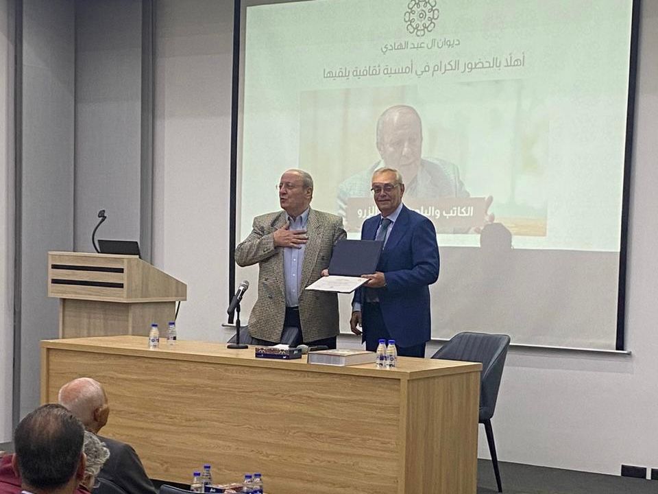 في نهاية اللقاء تسلم الباحث والكاتب نواف الزرو شهادة تقدير من رئيس الهيئة الإداريه المحامي معتز عبد الهادي.