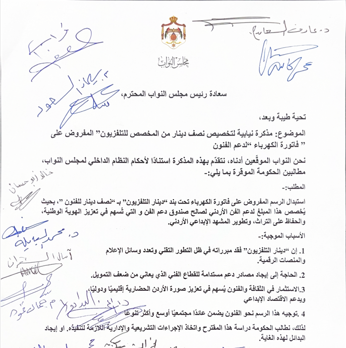 قدّم عدد من أعضاء مجلس النواب مذكرة نيابية إلى رئيس المجلس طالبوا فيها الحكومة باستبدال الرسم المفروض على فاتورة الكهرباء تحت بند "بدل التلفزيون” ليصبح "نصف دينار للفنون”، بحيث يُخصص هذا المبلغ لدعم صندوق وطني يُعنى بدعم الفنون والثقافة في الأردن.