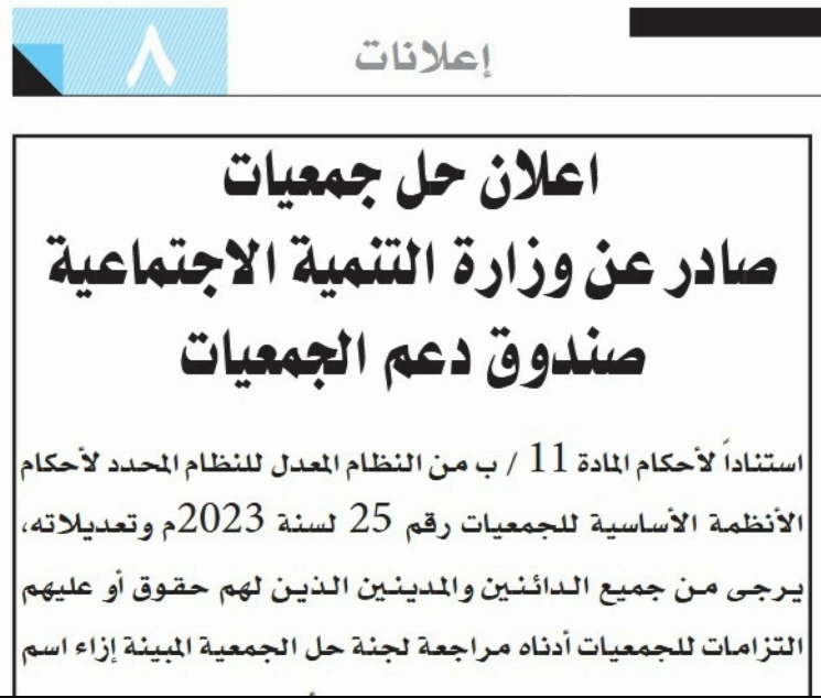استنادا لأحكام المادة 11/ب من النظام المحدد لأحكام الأنظمة الأساسية للجمعيات رقم 25 لسنة 2023م وتعديلاته يدعو صندوق دعم الجمعيات في وزارة التنمية الاجتماعية اليوم الثلاثاء جميع الدائنين والمدينين الذين لهم حقوق أو عليهم التزامات للجمعيات المذكورة تاليا إلى مراجعة لجنة حل الجمعيات المبينة إزاء كل اسم في الجدول التالي خلال شهر من تاريخه، على أن تكون المطالبات معززة بالوثائق والمستندات.