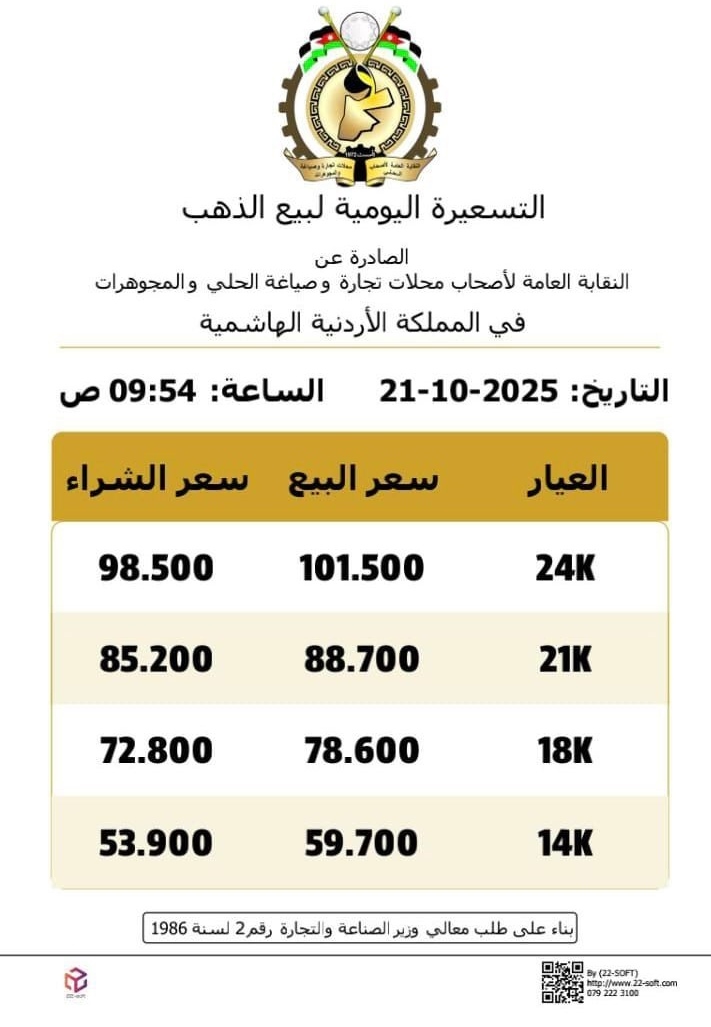 أما أسعار بيع غرام الذهب لعيارات 24 و18 و14 في محلات الصاغة، فقد بلغت 101.5 دينار، و78.60 دينار، و59.7 دينار على التوالي.