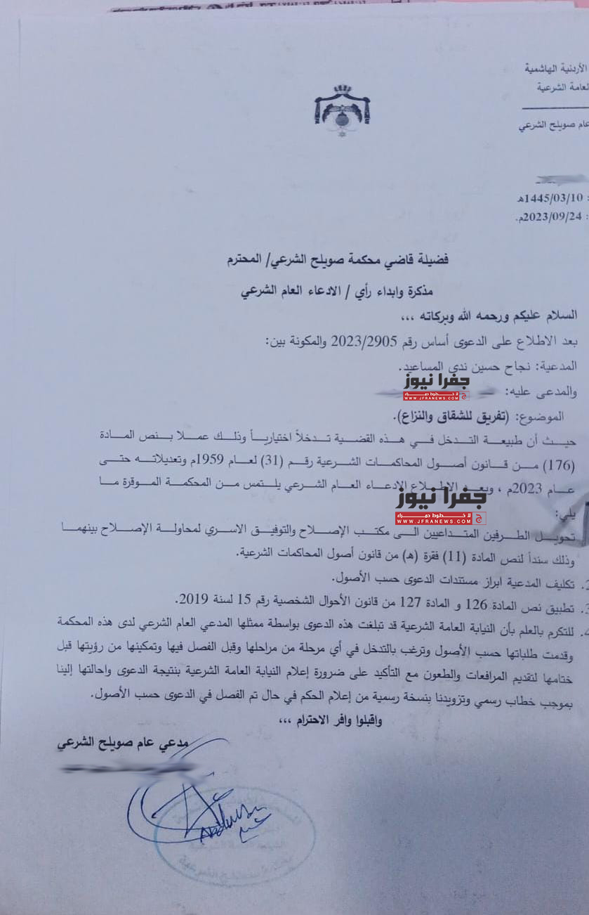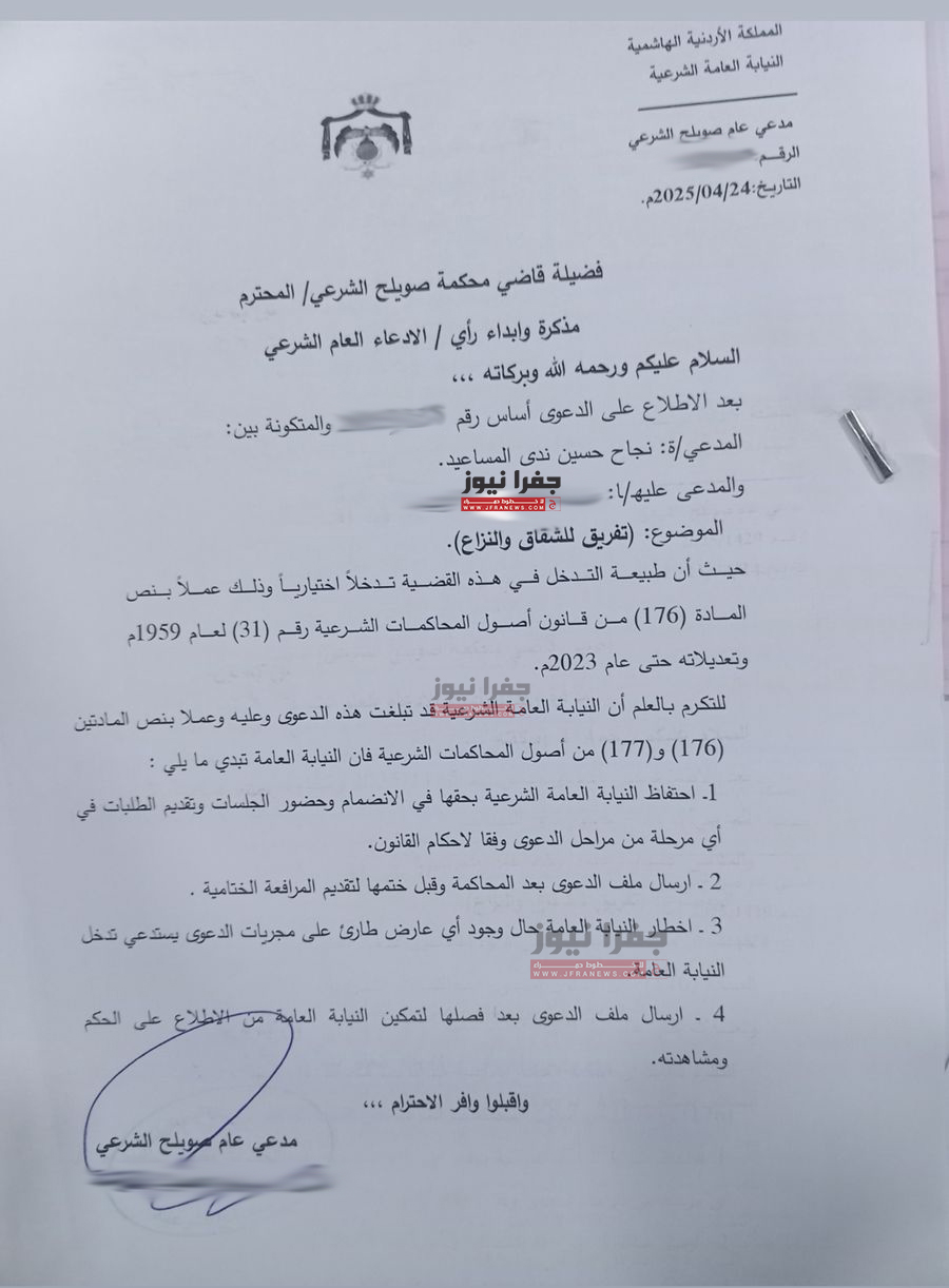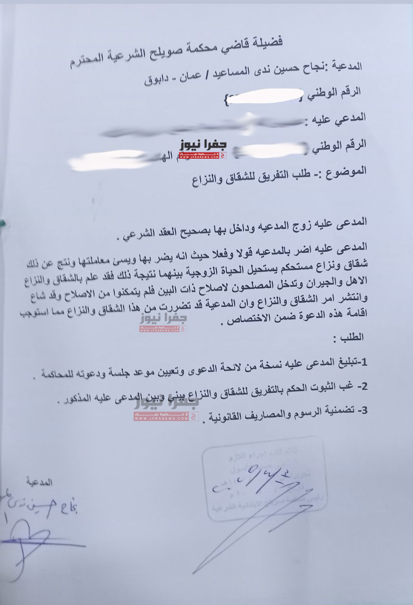 وفي التفاصيل والوثائق التي حصلت عليها "جفرا نيوز" من مقربون من المساعيد ، فإنها سبق وتقدمت بدعوى طلاق أخرى بتاريخ 24 أيلول عام 2023، وهو ما يفند الأخبار الأخيرة المتداولة، التي تتحدث أن المساعيد افتعلت قصة السرقة؛ لأن زوجها أراد الانفصال عنها، وفق المصادر.