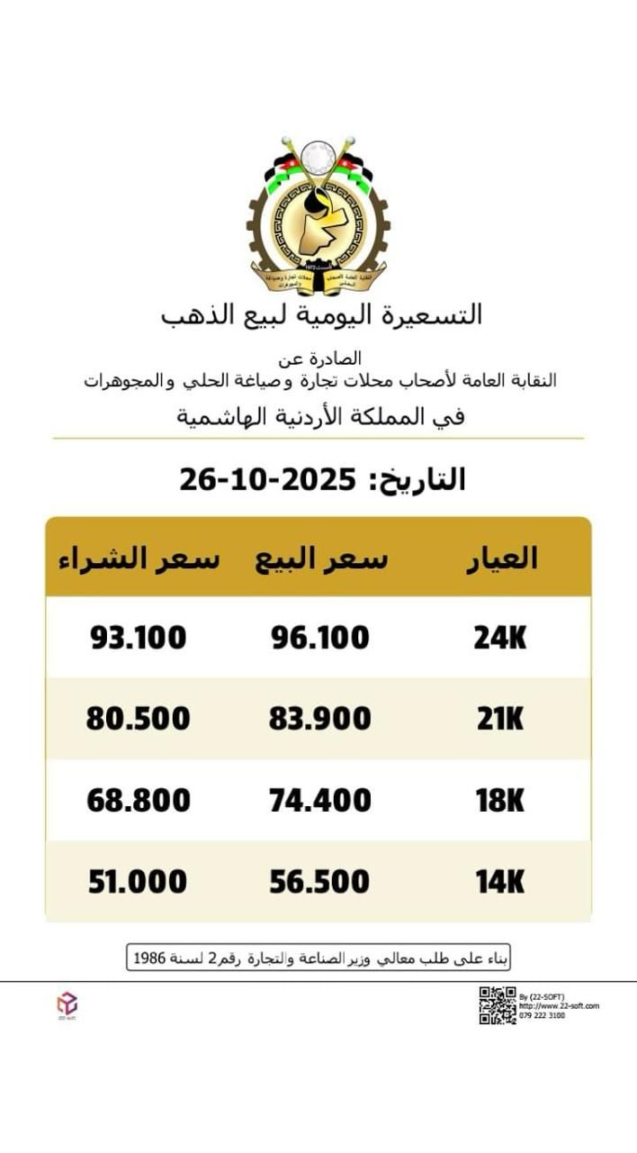وحسب النشرة اليومية التي أصدرتها النقابة العامة لأصحاب محلات تجارة وصياغة الحلي والمجوهرات، بلغ سعر الغرام الواحد من الذهب عيارات 24 و18 و 14 لغايات البيع من محلات الصاغة عند 96.1 و 74.4 و 56.5 دينار على التوالي.