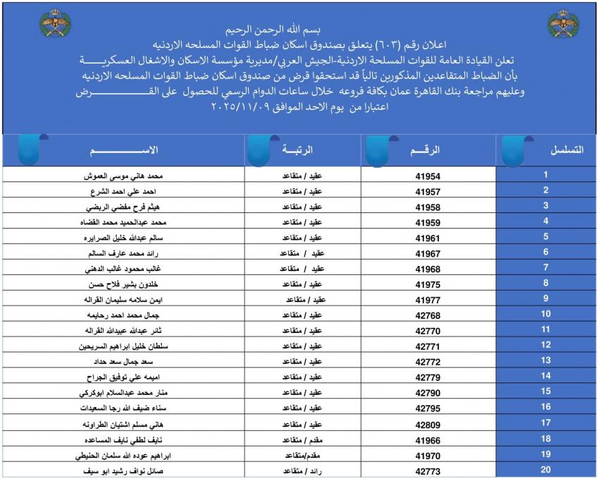 أعلنت القيادة العامة للقوات المسلحة الأردنية – الجيش العربي/ مديرية مؤسسة الإسكان والأشغال العسكرية اسماء الضباط وضباط الصف والأفراد المستحقين لقرض الإسكان العسكري (الخاص بالافراد) والضباط المستفيدين من صندوق إسكان الضباط.