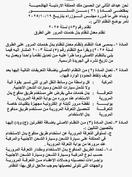 صدر في عدد الجريدة الرسمية اليوم الخميس، النظام المعدل لنظام بدل خدمات المرور على الطريق.