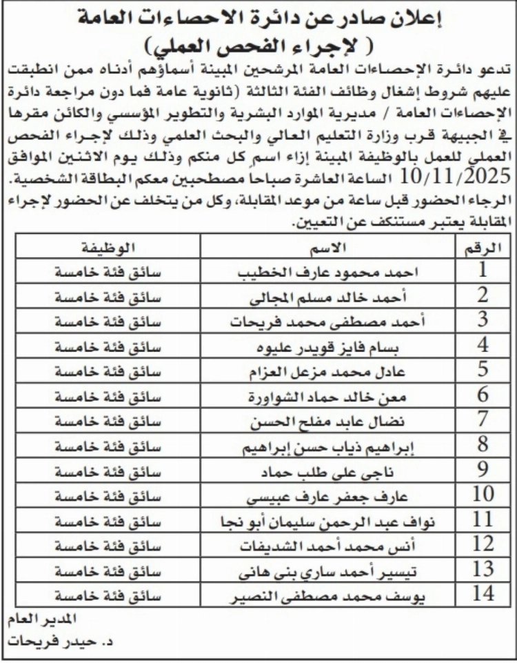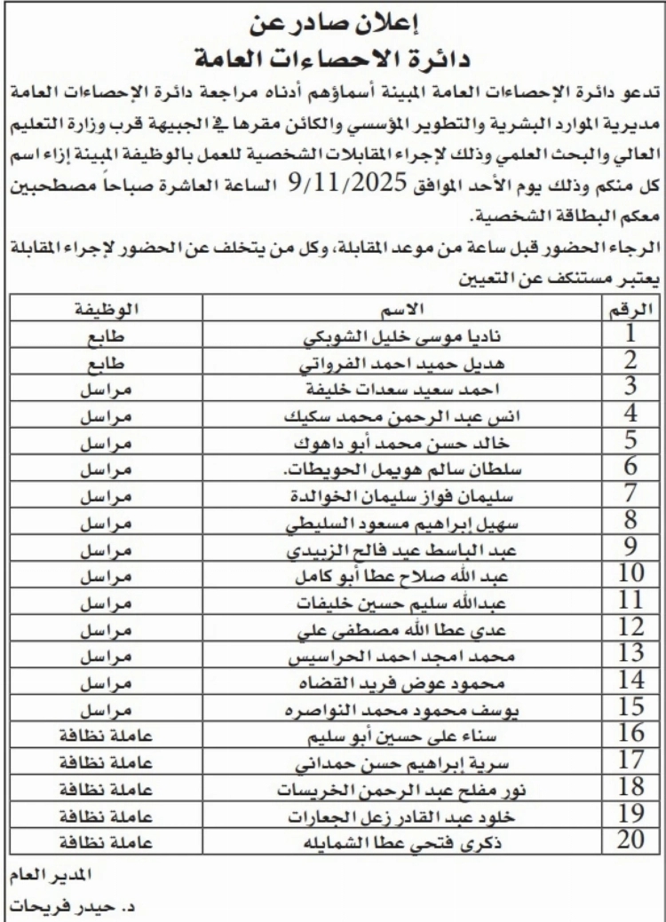 دعت دائرة الاحصاءات العامة الاردنية ،المبينة اسماؤهم ادناه ، مراجعة دائرة الإحصاءات العامة للمقابلات الشخصة في الدائرة التي ستجري في مبنى الدائرة بمنطقة الجبيهة قرب وزارة التعليم العالي والبحث العلمي يوم الأحد 9 / 11/ 2025 الساعة العاشرة صباحا.