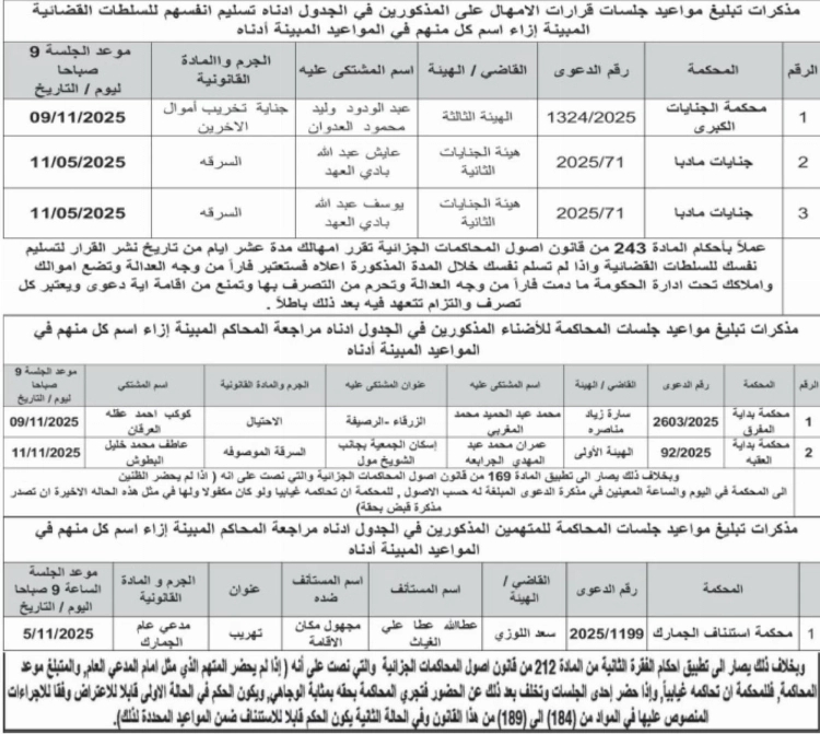 ونشرت المحاكم اسماء المتهمين عملا باحكام الماده 243 من قانون اصول المحاكمات الجزائية .