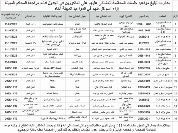 وفي مذكرات اخرى طالبت محاكم متهمين مراجعه المحاكم المبينة ازاء اسم كل منهم في المواعيد المبينة.