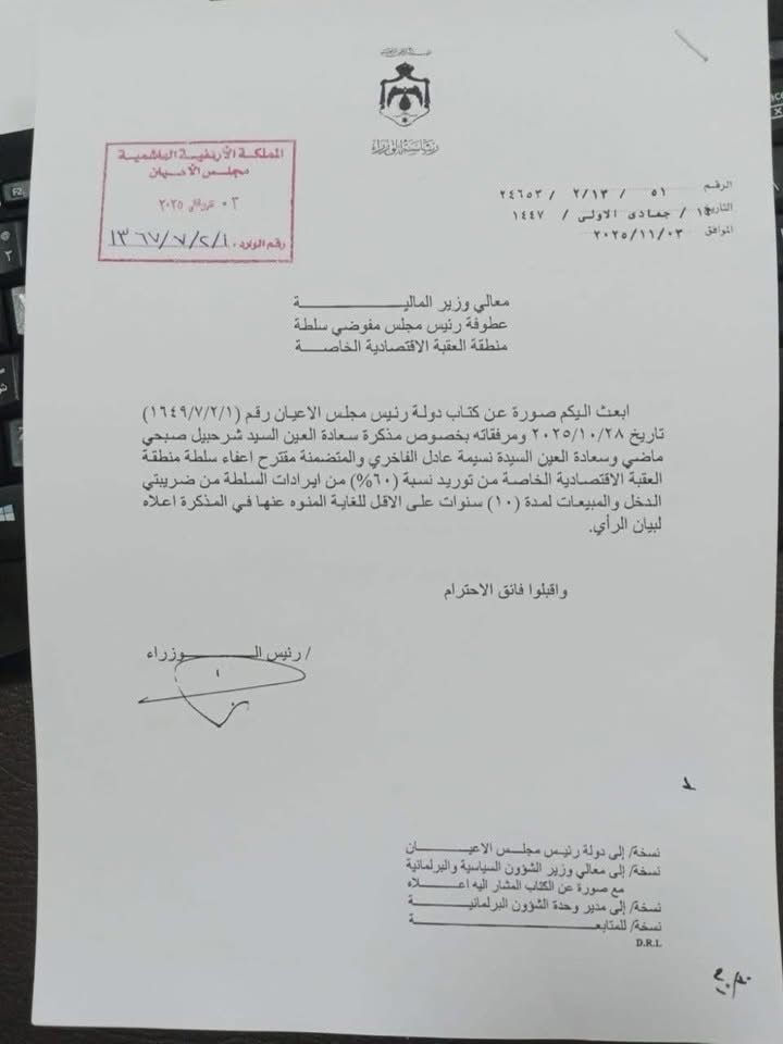 وتلقى رئيس الوزراء الدكتور جعفر حسان مذكرة من الفايز تحمل الرقم ١٦٤٩/٧/٢/١ طلب