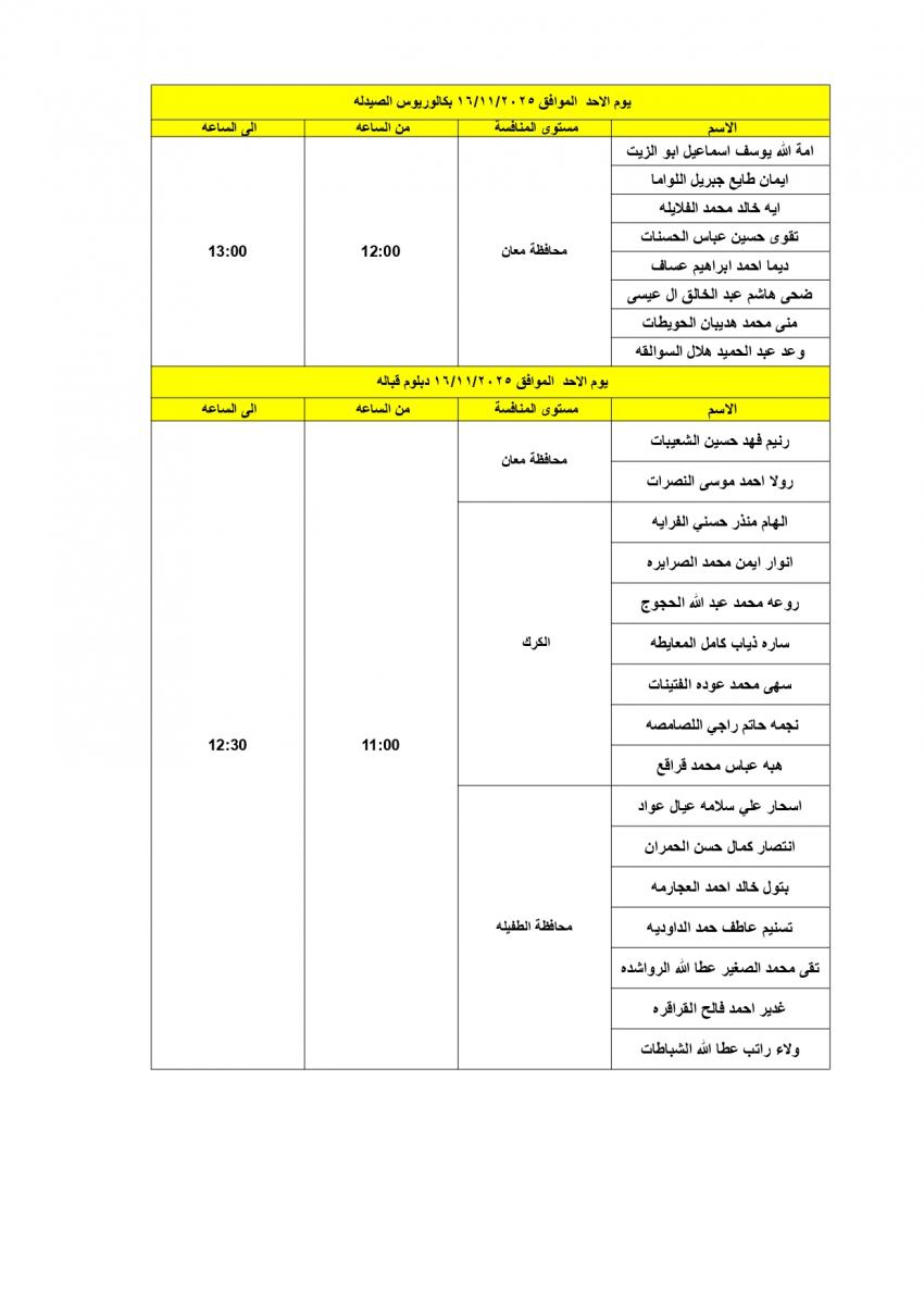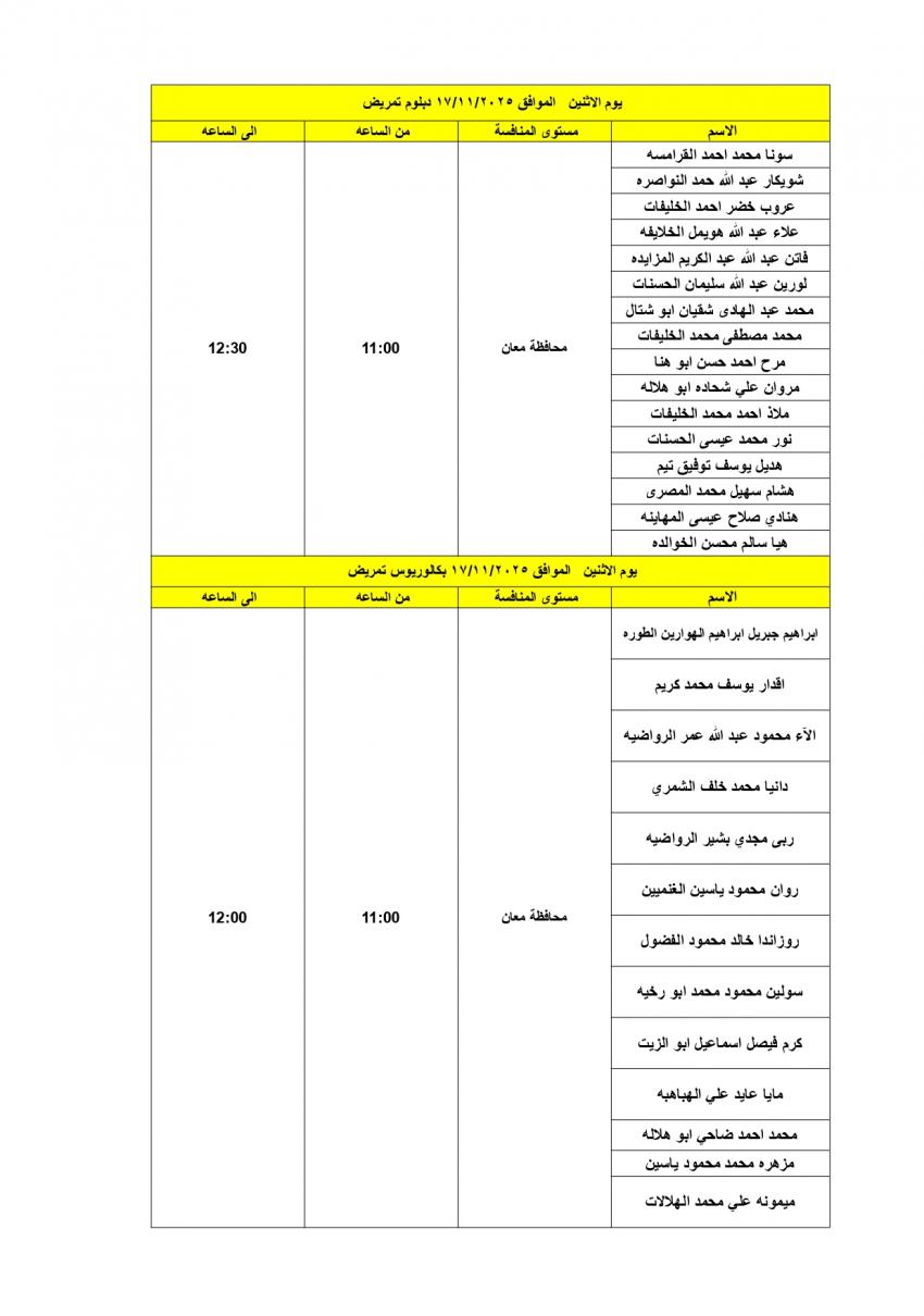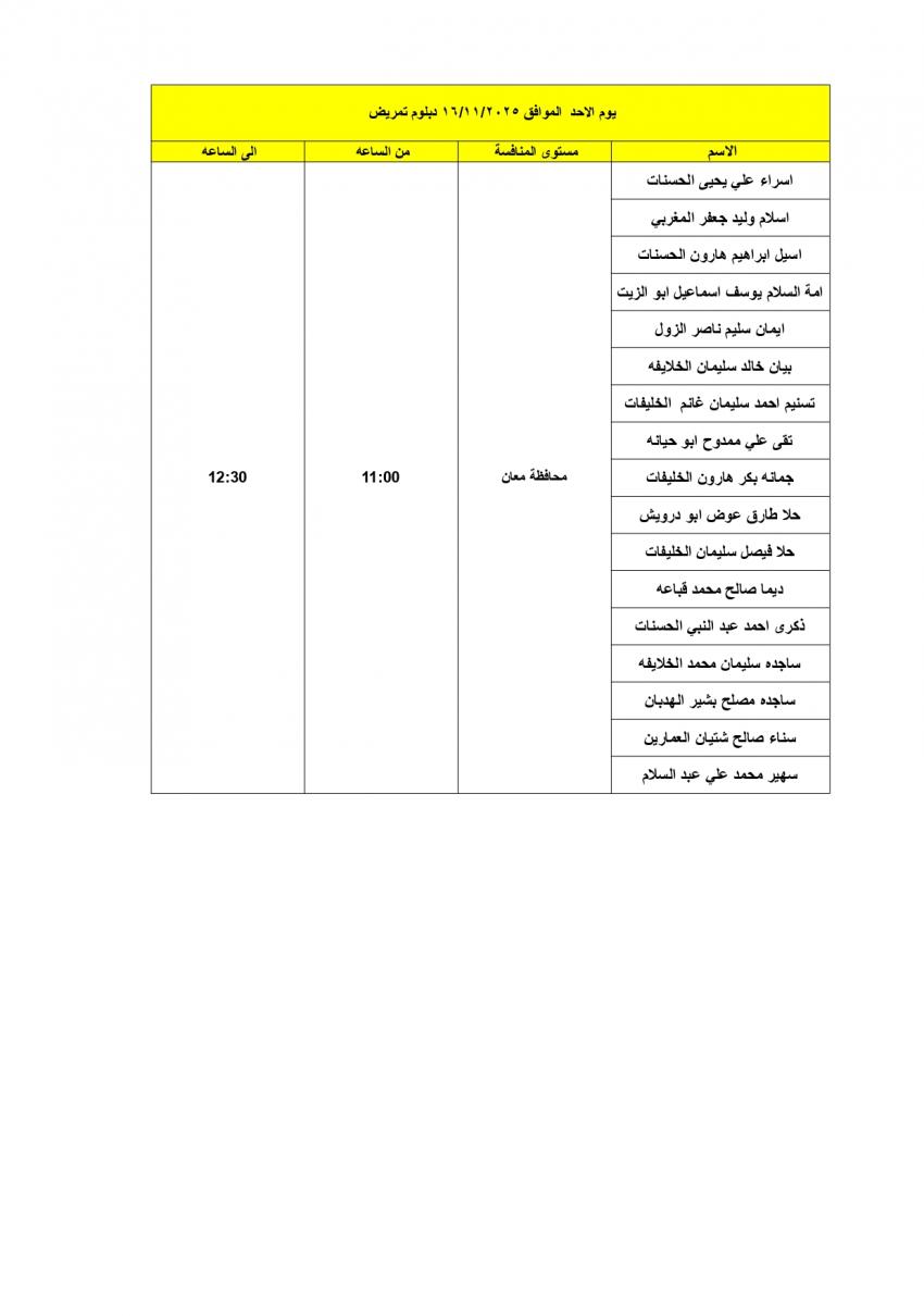 دعت وزارة الصحة المرشحين المبينة أسماؤهم أدناه والذين اجتازوا الامتحان التنافسي بنجاح التواجد في مديرية الموارد البشرية / الطابق التاسع في مبنى الوزارة الكائن في طبربور قرب مستشفى الامير حمزة في الموعد المحدد ، لإجراء المقابلة الشخصية؛ لغاية التعيين .