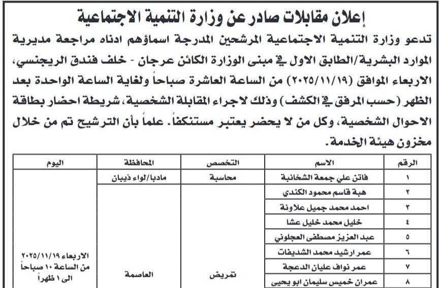 كما دعت مؤسسات حكومية التالية أسماؤهم لإجراء المقابلة الشخصية: