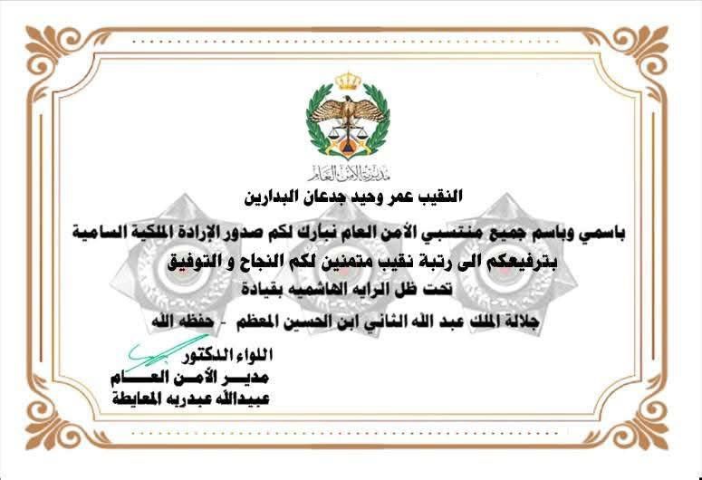 عمر وحيد جدعان البدارين بمناسبة صدور الارادة الملكية السامية بترفيعه إلى رتبة نقيب