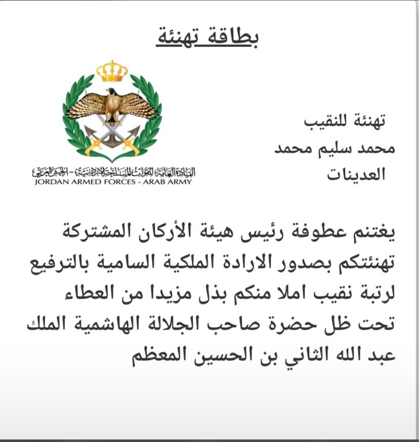 جفرا نيوز - يتقدّم محمد فايز بلح بأسمى آيات التهنئة والتبريك إلى الأخ والصديق محمد سليم العدينات بمناسبة صدور الإرادة الملكية السامية بترفيعه إلى رتبة نقيب، متمنيًا له دوام التوفيق والعطاء في مسيرته العملية.