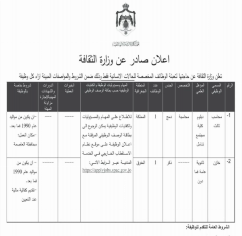 أعلنت وزارات ومؤسسات حكومية، اليوم الأحد عن حاجتها لتعبئة وظائف شاغرة.