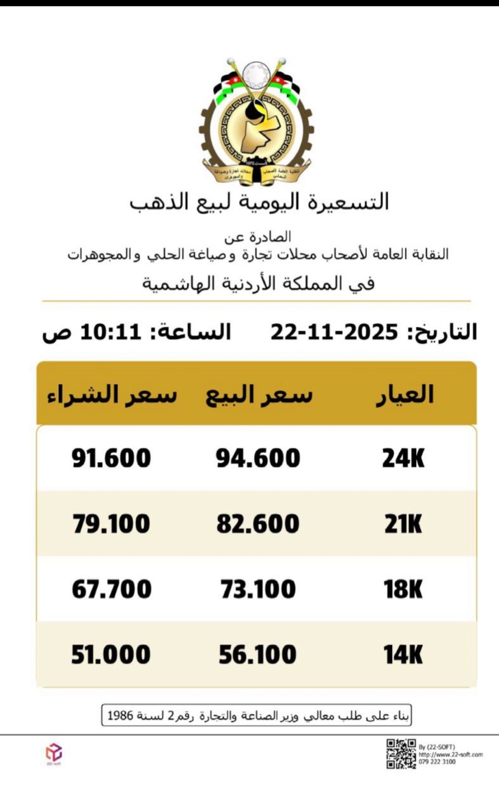 ووفق النقابة العامة لأصحاب محال تجارة وصياغة الحلي والمجوهرات، ارتفع سعر بيع غرام الذهب من عيار (21) ليسجل 82.60 دينارا، والشراء 79.10 دينارا.