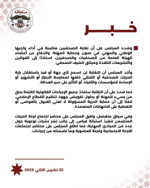 وشدد المجلس على أن نقابة الصحفيين ماضية في أداء واجبها الوطني والمهني في صون وحماية المهنة، والدفاع عن أعضاء الهيئة العامة من الصحفيات والصحفيين، استنادًا إلى القوانين والتشريعات النافذة وميثاق الشرف الصحفي.