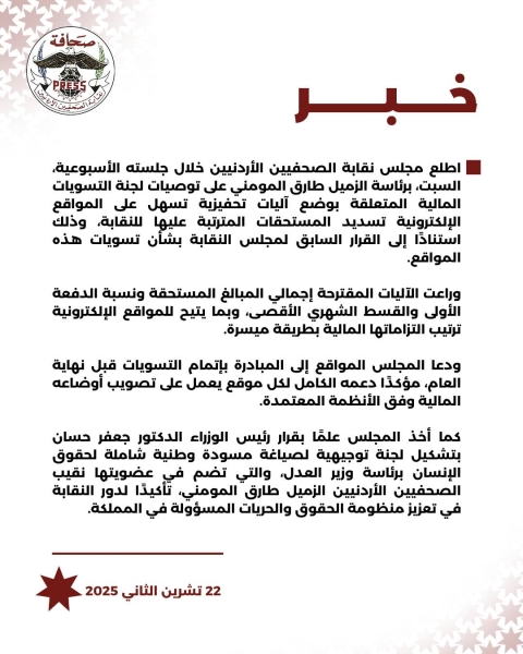 كما أخذ المجلس علمًا بقرار رئيس الوزراء الدكتور جعفر حسان بتشكيل لجنة توجيهية لصياغة مسودة وطنية شاملة لحقوق الإنسان برئاسة وزير العدل، والتي تضم في عضويتها نقيب الصحفيين الأردنيين الزميل طارق المومني، تأكيدًا لدور النقابة في تعزيز منظومة الحقوق والحريات المسؤولة في المملكة.