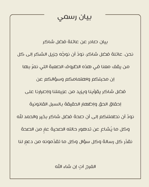 ونشر الفنان محمد فضل شاكر عبر حساباته الرسمية في شبكات التواصل الاجتماعي، بياناً جاء فيه: "نحن عائلة فضل شاكر، نودّ أن نقدّم جزيل الشكر إلى كل مَن يقف معنا في هذه الظروف الصعبة التي نمرّ بها. إن محبّتكم واهتمامكم وسؤالكم عن فضل شاكر تقوّينا وتزيد من عزيمتنا وإصرارنا على إحقاق الحق وإظهار الحقيقة بالسبل القانونية".