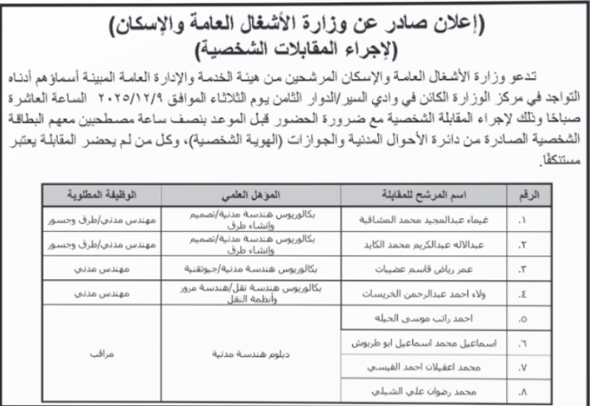 كما دعت وزارة الاشغال التالية اسماؤهم لاجراء المقابلة الشخصية.