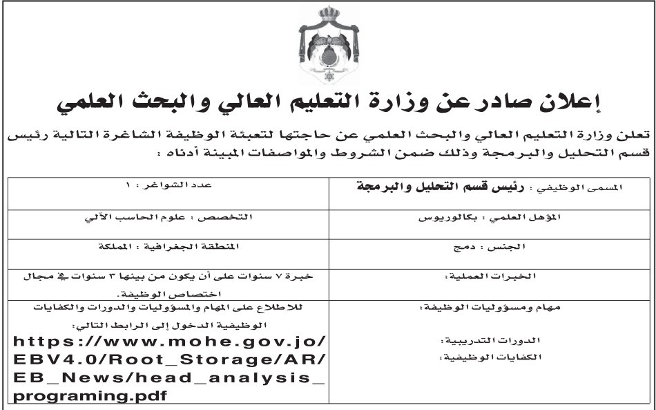اعلنت وزارات، اليوم الاثنين، عن حاجتها لتعبئة وظائف شاغرة.