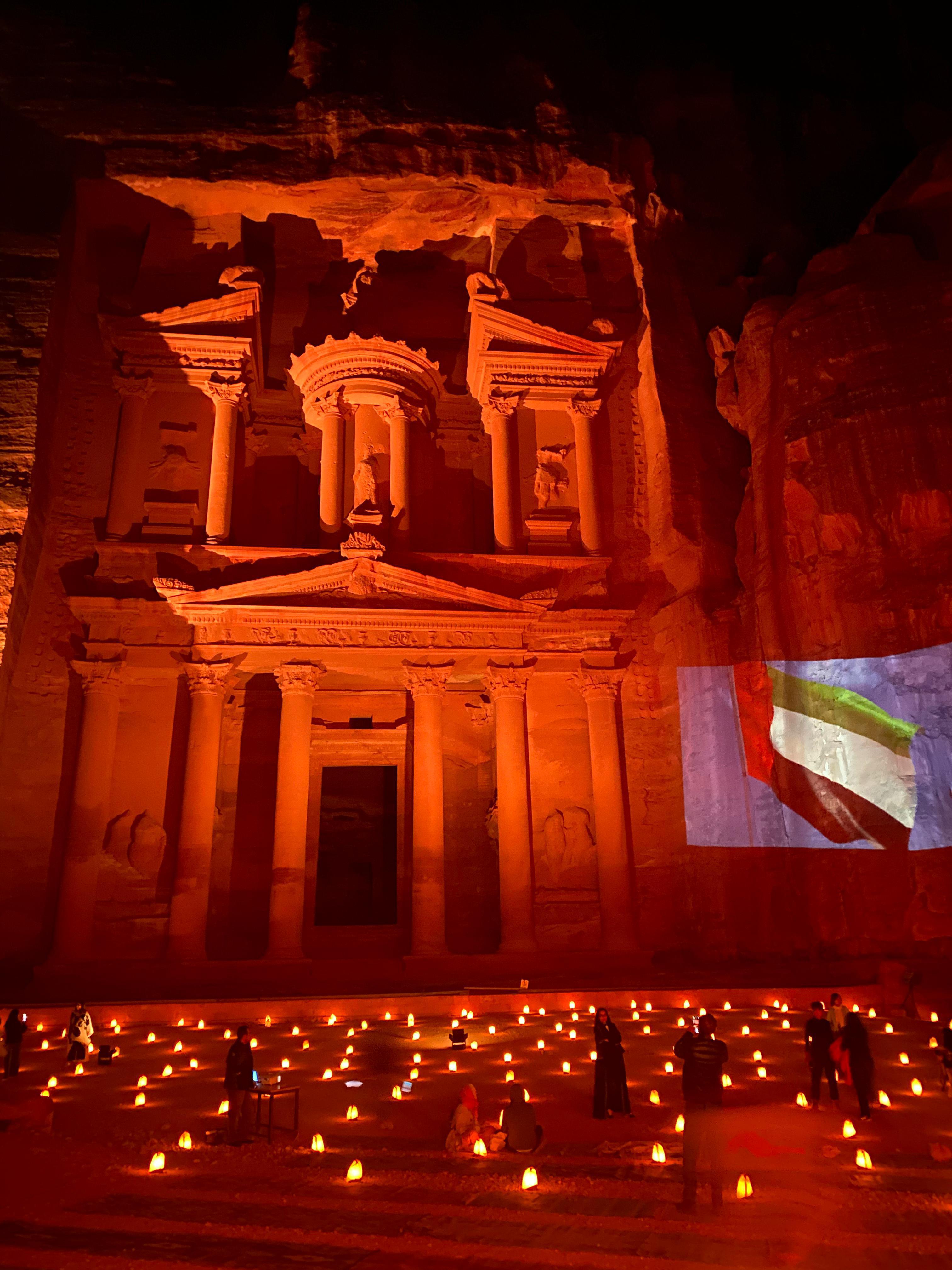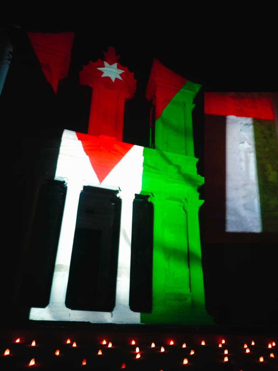 أضاءت سلطة إقليم البترا التنموي السياحي بالتعاون مع السفارة الإماراتية في عمّان، مساء الاثنين، واجهة الخزنة في مدينة البترا الوردية بعلم دولة الإمارات العربية المتحدة، احتفالا بعيد الاتحاد الرابع والخمسين، ومشاركة الأشقاء في الإمارات فرحتهم بهذه المناسبة الوطنية.