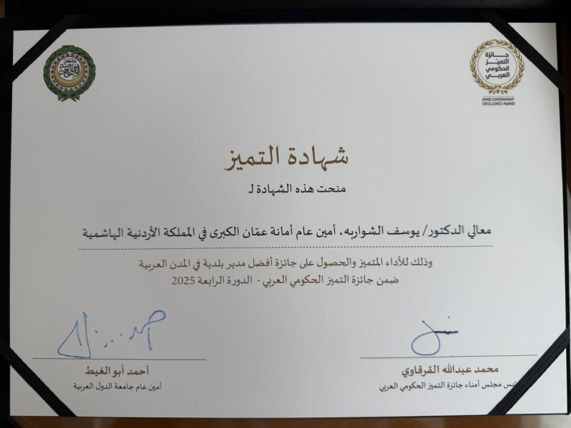 جاء ذلك خلال تسلمه جائزة التميز الحكومي العربي عن فئة "أفضل مدير بلدية في المدن العربية" ( امانة عمان الكبرى) ، في حفل أقيم في مقر جامعة الدول العربية في القاهرة لتكريم الفائزين في الدورة الرابعة للجائزة 2025، برعاية نائب رئيس دولة الإمارات العربية، رئيس مجلس الوزراء، حاكم امارة دبي صاحب السمو الشيخ محمد بن راشد آل مكتوم، و حضور الامين العام لجامعة الدول العربية احمد ابو الغيط.