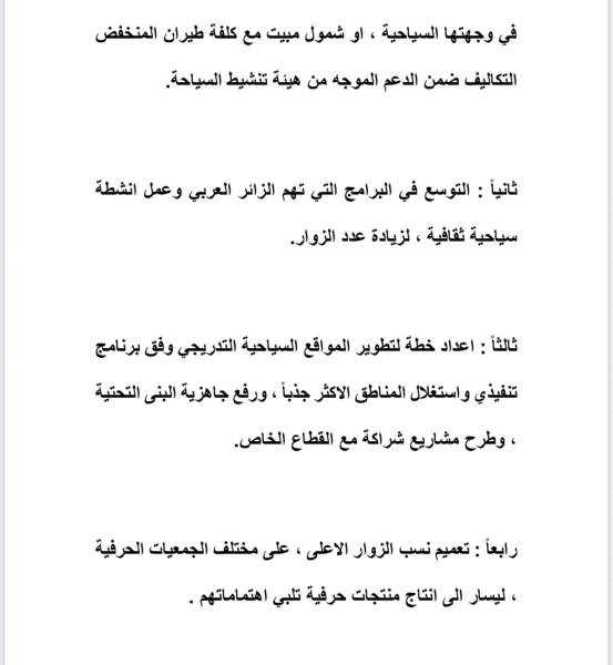 إعداد خطة تطوير تدريجية للمواقع السياحية وطرح مشاريع شراكة مع القطاع الخاص.