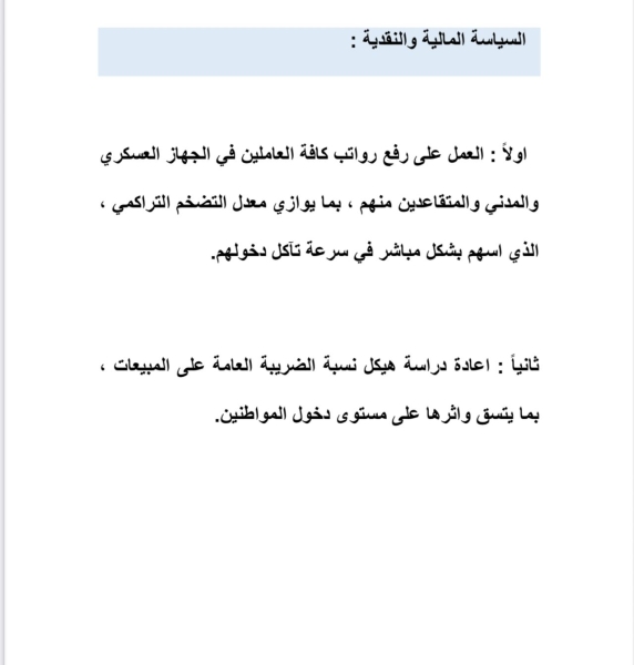 رفع رواتب العاملين في القطاعين العسكري والمدني والمتقاعدين بما يعادل التضخم التراكمي.