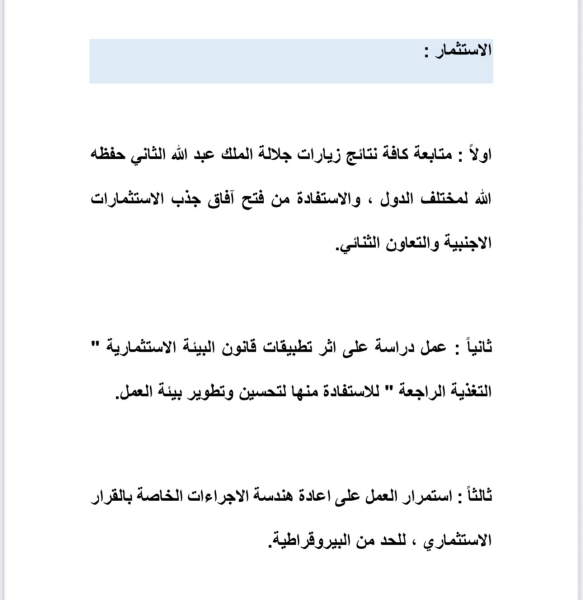 متابعة نتائج زيارات جلالة الملك لتعظيم فرص الاستثمار.
