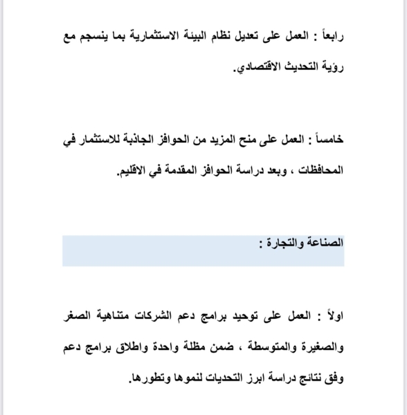 تعديل نظام البيئة الاستثمارية بما ينسجم مع رؤية التحديث الاقتصادي.