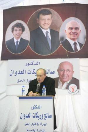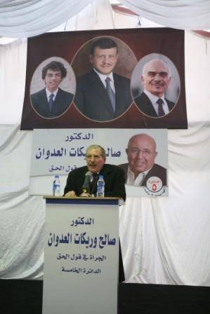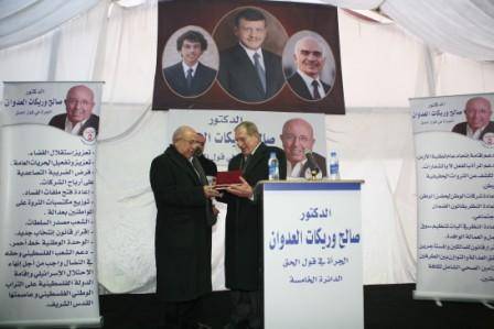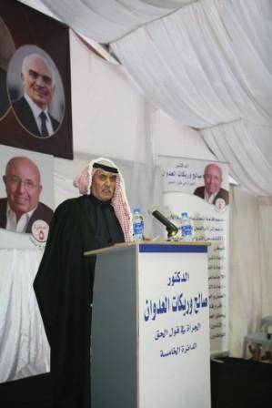 وفي كلمته التي شكر فيه الحضور اكد الدكتور صالح وريكات العدوان على تصميمه على ان يكون عند حسن ظن ابناء الدائرة الخامسة فيه وابناء الوطن كله واكد على ما جاء في بيانه الانتخابي وعلى الظرف الدقيق الذي يمر فيه الوطن واهمية المجلس القادم لتغيير صورة الوطن نحو الافضل.