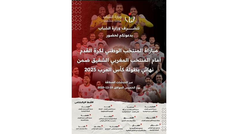أعلنت وزارة الشباب عن عرض مباراة المنتخب الوطني في نهائي بطولة كأس العرب في المدن والمجمعات والصالات الرياضية بمختلف محافظات المملكة، لإتاحة الفرصة أمام جماهير النشامى لمتابعة اللقاء في أجواء وطنية حماسية.