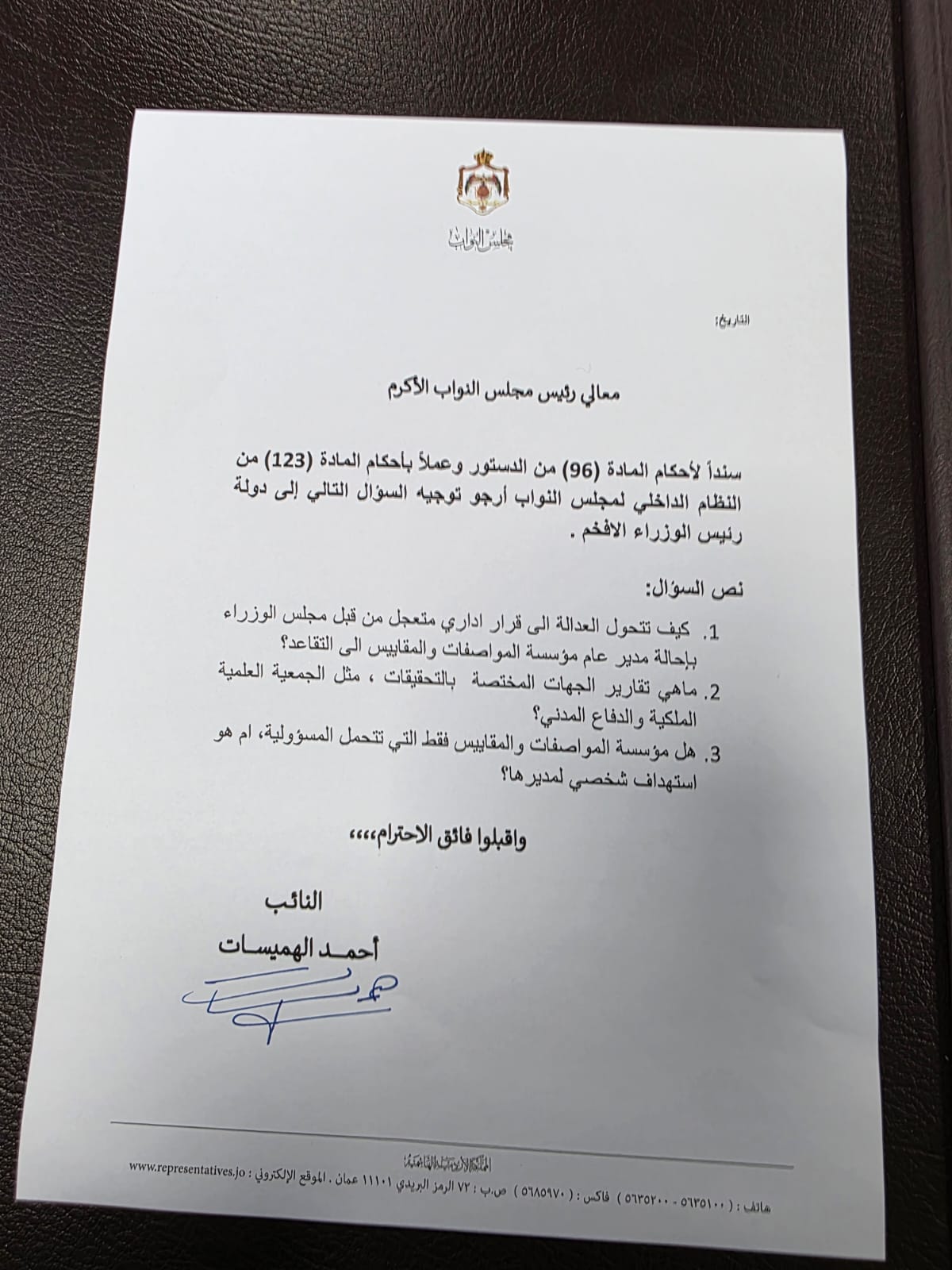 وجه النائب أحمد هميسات سؤالًا نيابيا إلى الحكومة، حول أسباب إحالة مديرة مؤسسة المواصفات والمقاييس على التقاعد.