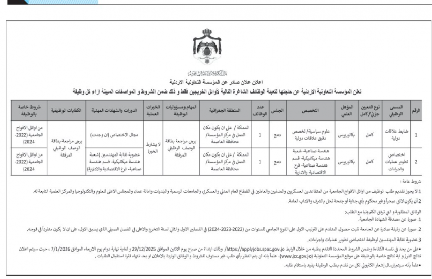 كما أعلنت المؤسسة التعاونية الأردنية، عن حاجتها لتعيين أشخاص.
