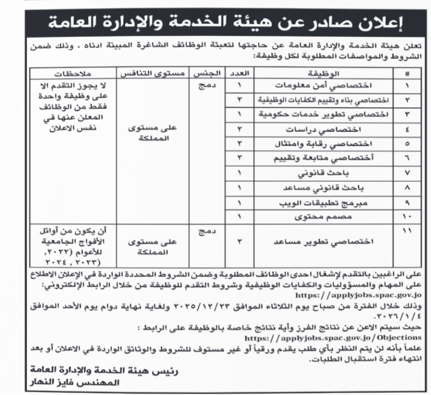 أعلنت هيئة الخدمة والإدارة العامة، حاجتها لتعبئة شواغر وظيفية لصالح الهيئة.
