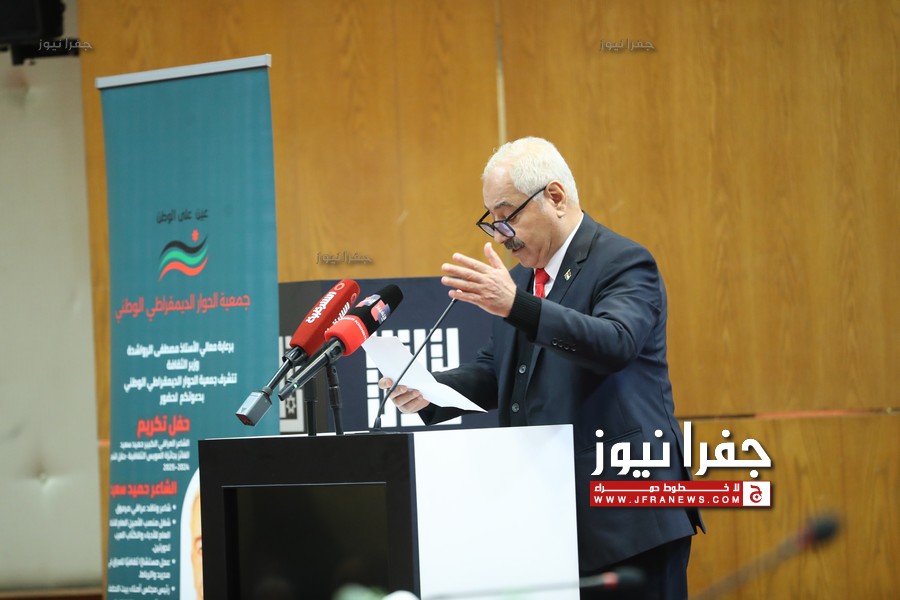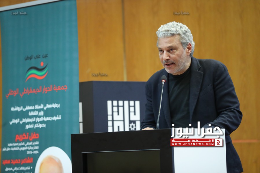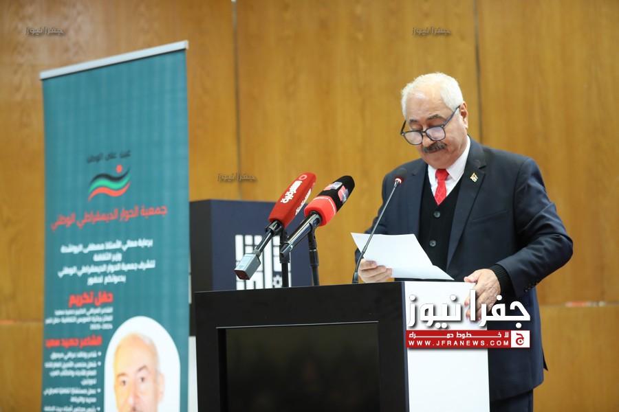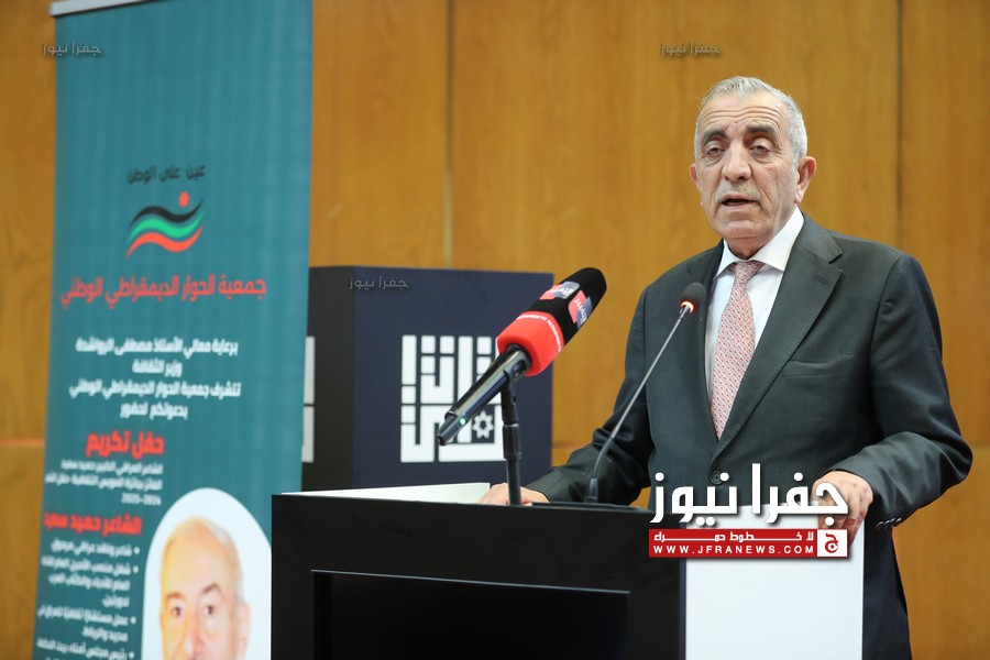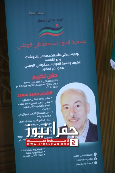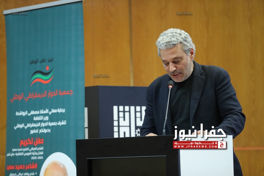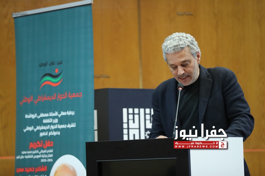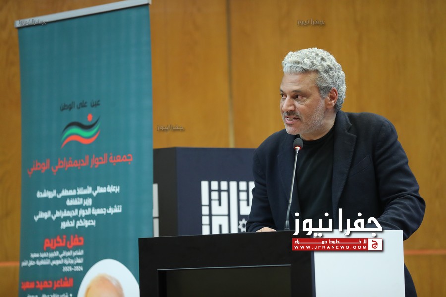 رعى وزير الثقافة مصطفى الرواشدة الاحتفالية الكبرى التي نظمتها جمعية الحوار الديمقراطي الوطني للشاعر العراقي الأستاذ حميد سعيد بمناسبة فوزه بجائزة العويس الثقافية - حقل الشعر في المركز الثقافي الملكي مساء أمس الاثنين بحضور الأستاذ نضال الأحمد أمين عام وزارة الثقافة.