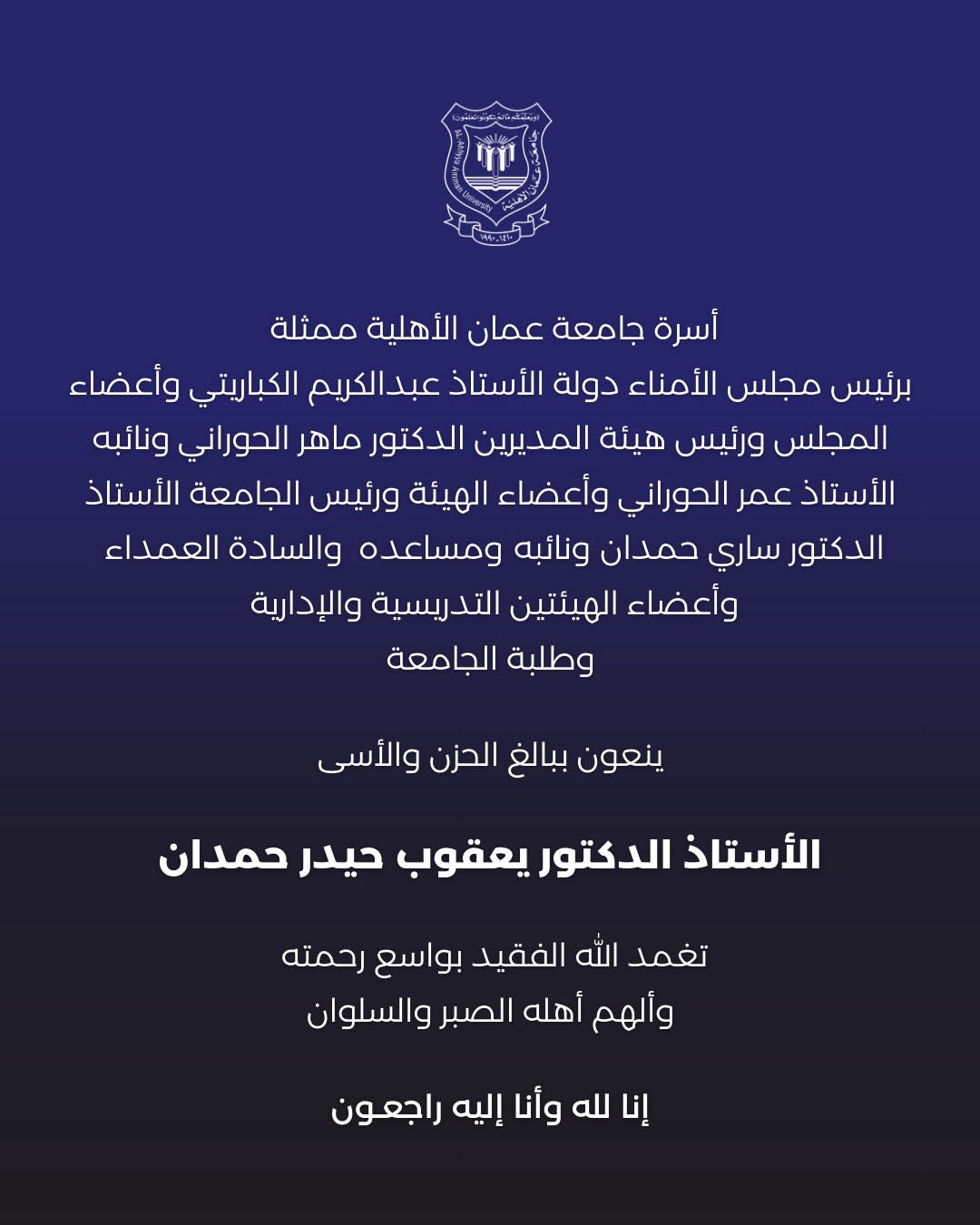 أسرة جامعة عمان الأهلية ممثلة برئيس مجلس الأمناء دولة الأستاذ عبد الكريم الكباريتي وأعضاء المجلس