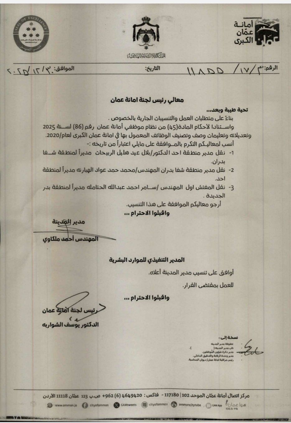قرر رئيس لجنة أمانة عمّان الكبرى الدكتور يوسف الشواربة، الموافقة على تنسيب مدير المدينة المهندس أحمد ملكاوي، على نقل مدراء مناطق.