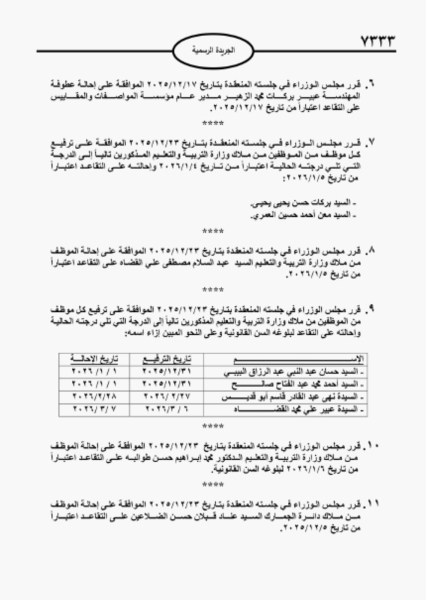 وافق مجلس الوزراء اليوم الأربعاء على ترفيع عدد من الموظفين وإنهاء خدمات آخرين، بالإضافة إلى إحالة موظفين إلى التقاعد في عدة وزارات ودوائر حكومية.
